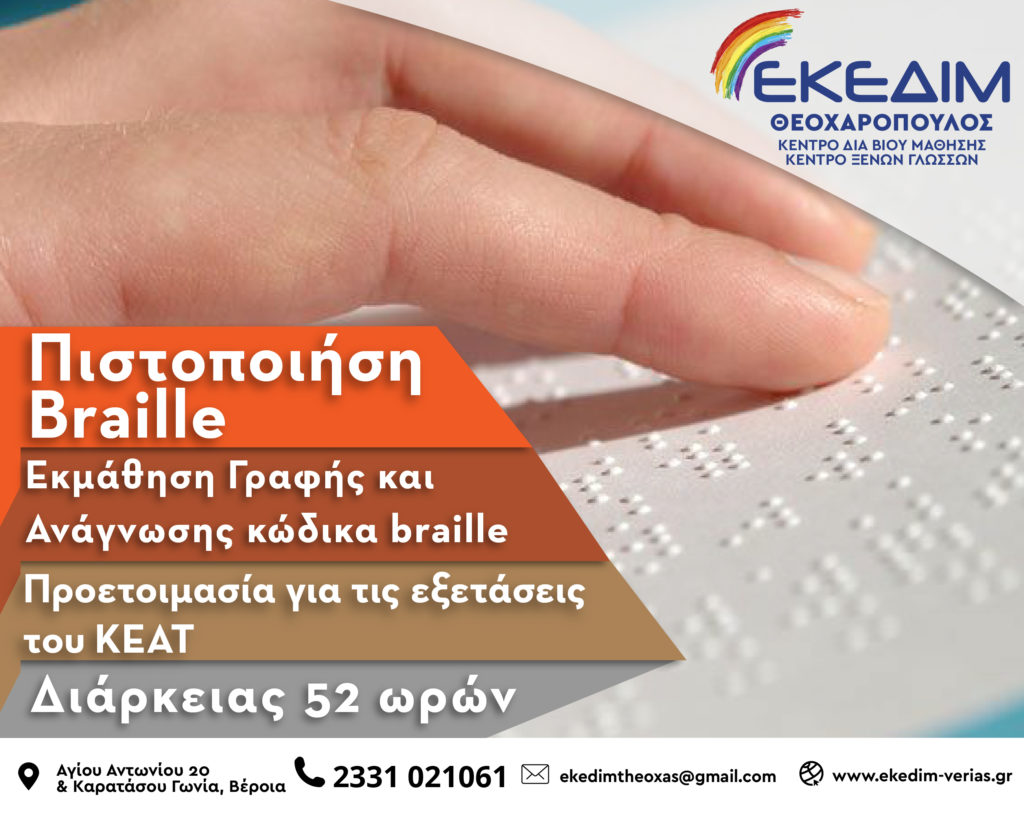 Το ΕΚΕΔΙΜ Θεοχαρόπουλος , στα πλαίσια της συνεργασίας με τον Πανελλήνιο Σύνδεσμο Τυφλών, Περιφερειακή Ένωση Κεντρικής Μακεδονίας, υλοποιεί Θερινά τμήματα εκμάθησης του συστήματος γραφής και ανάγνωσης Braille για τυφλούς με πιστοποίηση.