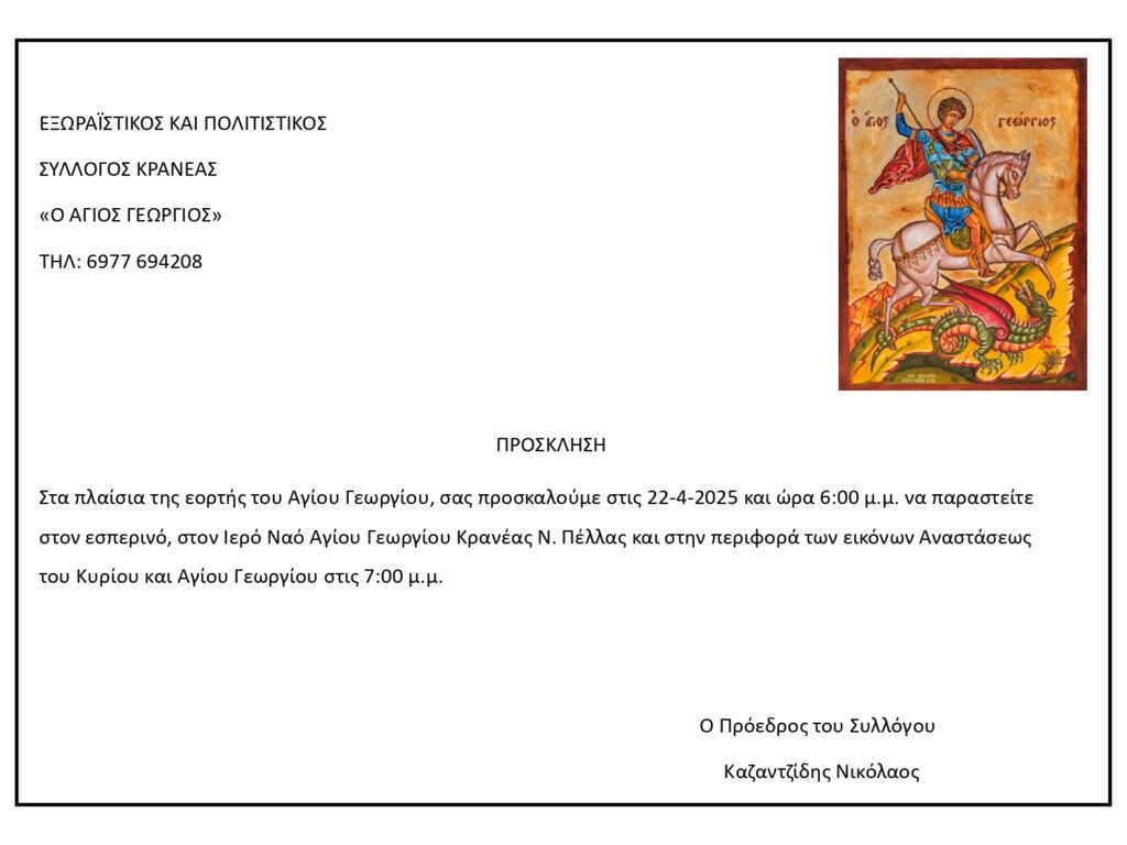 Πρόσκληση – Εξωραϊστικός Πολιτιστικός Σύλλογος Κρανέας Δήμου Σκύδρας ‘ Ο Άγιος Γεώργιος΄