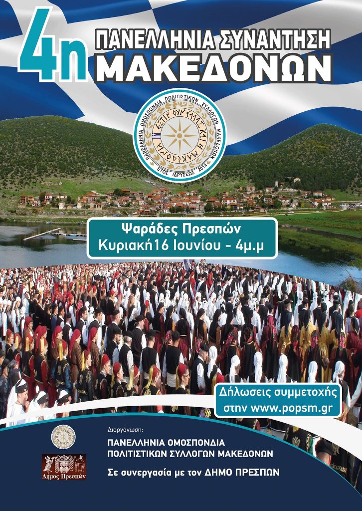 Η «ΠΑΝΕΛΛΗΝΙΑ ΟΜΟΣΠΟΝΔΙΑ ΠΟΛΙΤΙΣΤΙΚΩΝ ΣΥΛΛΟΓΩΝ ΜΑΚΕΔΟΝΩΝ», με διακριτικό τίτλο «ΠΑΜΜΑΚΕΔΟΝΙΚΗ ΕΝΩΣΗ ΕΛΛΑΔΟΣ» και μέλος των «ΠΑΜΜΑΚΕΔΟΝΙΚΩΝ ΕΝΩΣΕΩΝ ΥΦΗΛΙΟΥ», διοργανώνει, την Κυριακή 16 Ιουνίου 2019 και ώρα 4μμ, στο χωριό ψαράδες Πρεσπών, την «4η ΠΑΝΕΛΛΗΝΙΑ ΣΥΝΑΝΤΗΣΗ ΜΑΚΕΔΟΝΩΝ».