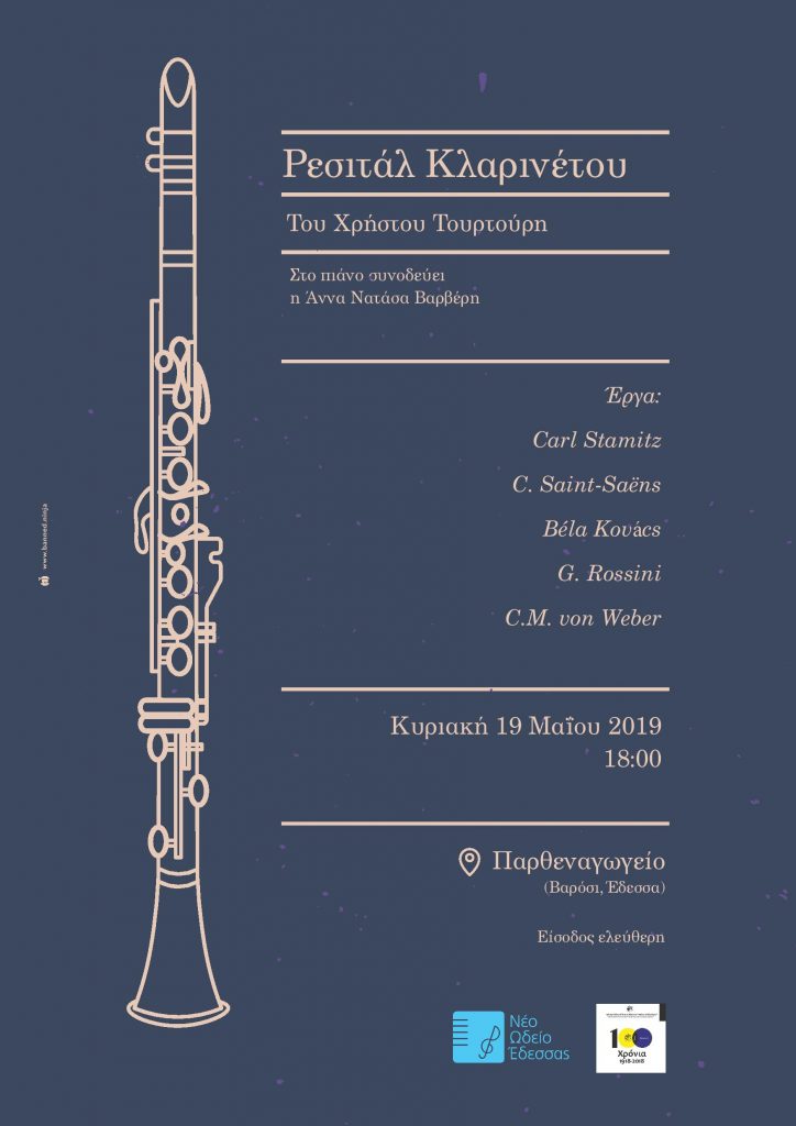 Ρεσιτάλ κλαρινέτου από τον Χρήστο Τουρτούρη, την Κυριακή 19 Μαίου στις 6 το απόγευμα, στο Παρθεναγωγείο (Βαρόσι, Έδεσσα). Στο πιάνο συνοδεύει η Άννα Νατάσα Βαρβέρη.