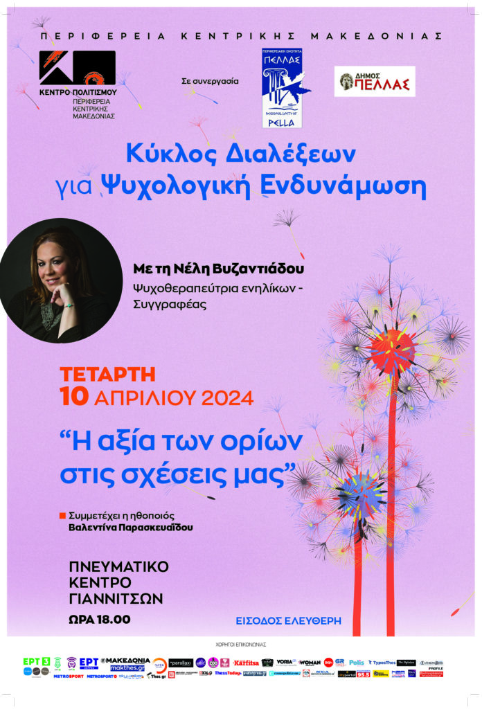 Το Κέντρο Πολιτισμού της Περιφέρειας Κεντρικής Μακεδονίας σε συνεργασία με την Περιφερειακή Ενότητα Πέλλας και τον Δήμο Πέλλας διοργανώνει σεμινάριο ψυχολογικής ενδυνάμωσης με την Νέλη Βυζαντιάδου – ψυχοθεραπεύτρια ενηλίκων , συγγραφέας.