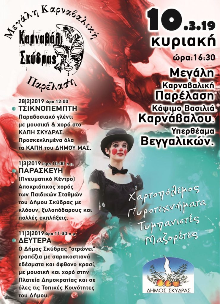 Απευθυνόμαστε, λοιπόν, σ΄όλες κι όλους: Ελάτε να παρακολουθήσετε τις Σκυδραϊκές Αποκριάτικες Εκδηλώσεις 2019, να τις ζήσετε, να νιώσετε ώρες χαράς και ξενοιασιάς, να τις ευχαριστηθείτε με την καρδιά σας. Διότι, είναι σίγουρο, πως θα σας μείνουν αξέχαστες!