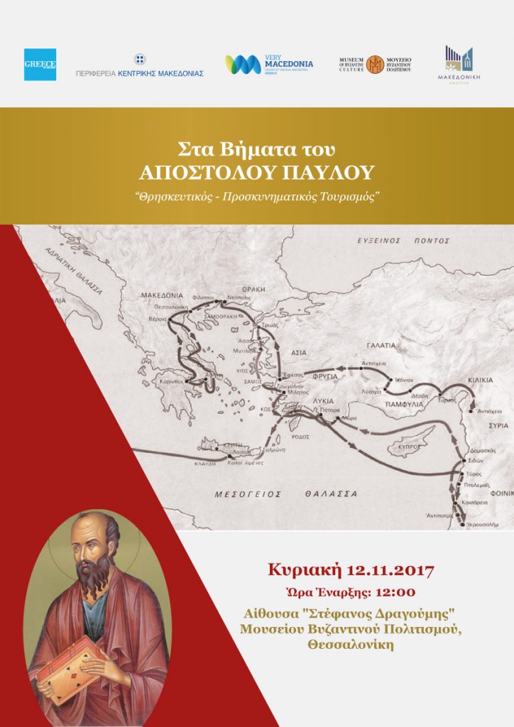 Την πρώτη διαπεριφερειακή εκδήλωση για το θρησκευτικό – προσκυνηματικό τουρισμό με τίτλο «Στα βήματα του Αποστόλου Παύλου» διοργανώνει η Περιφέρεια Κεντρικής Μακεδονίας την Κυριακή 12 Νοεμβρίου 2017 στις 12.00 το μεσημέρι στην αίθουσα «Στέφανος Δραγούμης» του Μουσείου Βυζαντινού Πολιτισμού στη Θεσσαλονίκη.