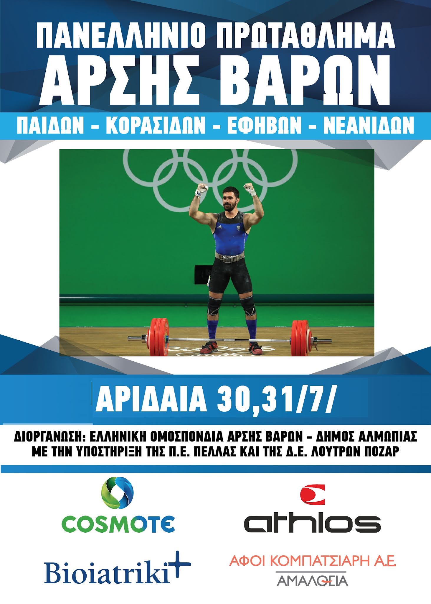 Στις 30, 31 Ιουλίου και 1η Αυγούστου στο Κλειστό Γυμναστήριο Αριδαίας θα πραγματοποιηθεί το Πανελλήνιο πρωτάθλημα Άρσης Βαρών Εφήβων – Νεανίδων, Παίδων – Κορασίδων. Το πρωτάθλημα διοργανώνεται από το Δήμο Αλμωπίας και την Ελληνική Ομοσπονδία Άρσης Βαρών, με την υποστήριξη της Π.Ε. Πέλλας και της Δημοτικής Επιχείρησης των Λουτρών Λουτρακίου Δήμου Αλμωπίας Α.Ε.