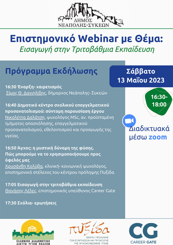 ♦ Το Κέντρο Πρόληψης «Πυξίδα» σε ειδική εκδήλωση-Webinar για την «Εισαγωγή στην Τριτοβάθμια Εκπαίδευση», που διοργανώνει ο δήμος Νεάπολης-Συκεών