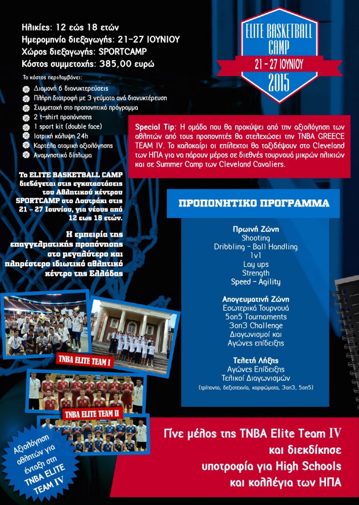 Τα camps της TNBA Greece αφορούν παίκτες όλων των ηλικιών και των επιπέδων. Πρόκειται για ολιγοήμερα εντατικά και εξειδικευμένα προπονητικά προγράμματα ατομικής βελτίωσης δεξιοτήτων σε ατομικό και ομαδικό επίπεδο. Οι συμμετέχοντες αθλητές θα μυηθούν σε προηγμένες τεχνικές ανάπτυξης των αγωνιστικών ικανοτήτων τους ενώ παράλληλα θα εξασκηθούν στον έλεγχο της ταχύτητας και της δύναμής τους. Τα camps πλαισιώνονται από διαγωνισμούς, happenings, guest εμφανίσεις διάσημων αθλητών από την Αμερική και δώρα.