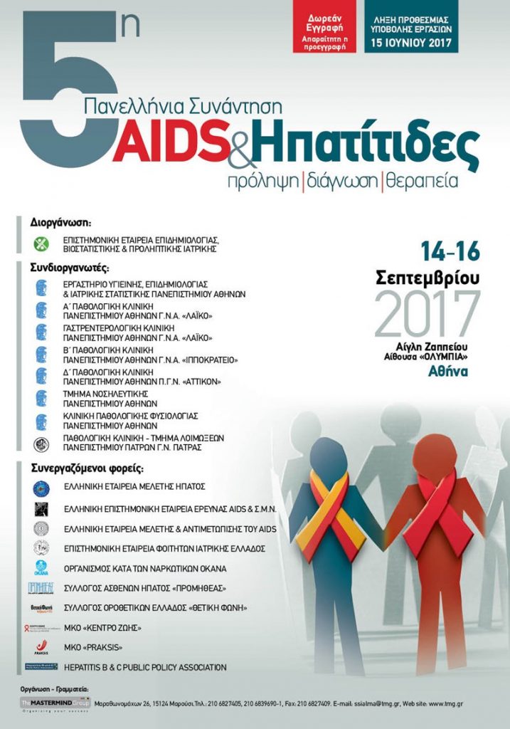 Στην 5η Πανελλήνια Συνάντηση με θέμα «AIDS και Ηπατίτιδες: πρόληψη, διάγνωση, θεραπεία» που θα πραγματοποιηθεί από τις 14 έως τις 16 Σεπτεμβρίου 2017 στην Αίγλη Ζαππείου στην Αθήνα θα συμμετάσχει η Διεύθυνση Δημόσιας Υγείας και Κοινωνικής Μέριμνας της Περιφέρειας Κεντρικής Μακεδονίας, με εκπροσώπηση από το Τμήμα Δημόσιας Υγείας.