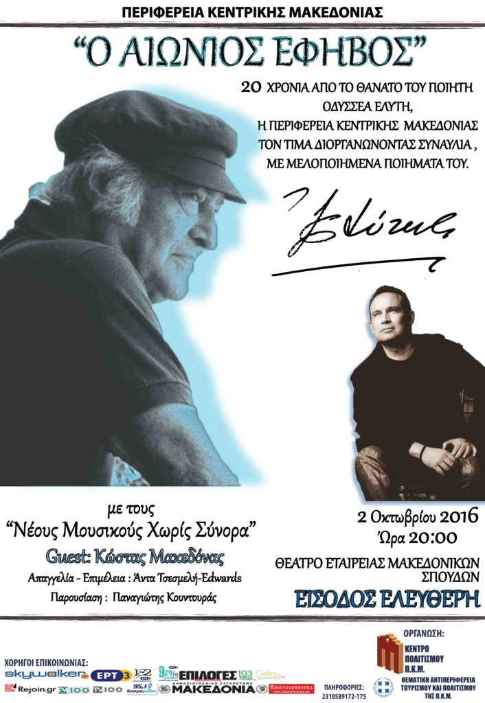 Φέτος συμπληρώνονται 20 χρόνια από τον θάνατο του Ελύτη(1911-1996) και η Περιφέρεια Κεντρικής Μακεδονίας τον τιμά διοργανώνοντας μια μουσική εκδήλωση, με μια δυναμική νεανική ορχήστρα τους «Νέους Μουσικούς Χωρίς Σύνορα» και Guest τον Κώστα Μακεδόνα. Θα ακουστούν απαγγελίες ποιημάτων αλλά και μελοποιημένα ποιήματα του ποιητή από τους «Προσανατολισμούς», τον «Ήλιο τον Ηλιάτορα», «Τα Ρω του έρωτα», και το «Άξιον Εστί».