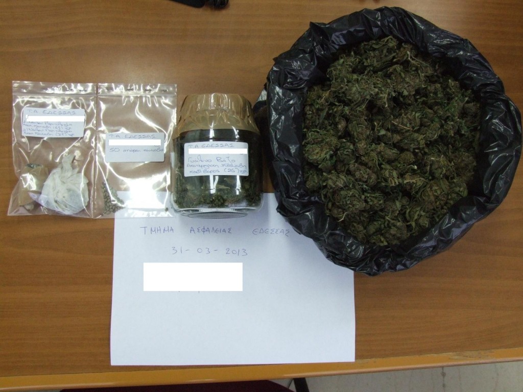 Συνελήφθησαν χθες (31.03.2013) το απόγευμα, από αστυνομικούς του Τμήματος Ασφαλείας Έδεσσας Πέλλας, δύο ημεδαποί 26 και 30 ετών, για παραβάσεις του νόμου “περί ναρκωτικών”.
