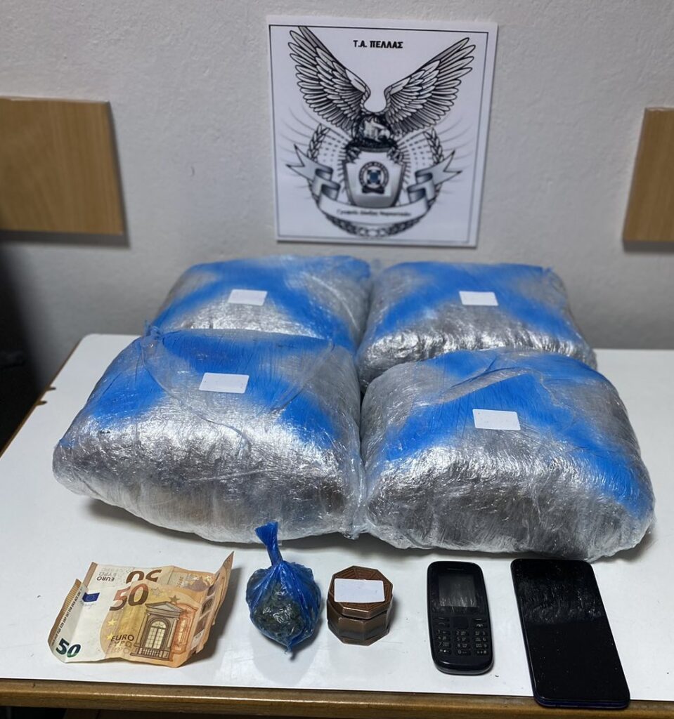 Ειδικότερα, στην πρώτη περίπτωση, από αστυνομικούς του Τμήματος Ασφάλειας Πέλλας, συνελήφθη ένας ημεδαπός άνδρας σε περιοχή της Ημαθίας, καθώς διαπιστώθηκε να αποκρύπτει σε αποθήκη στην οικία του -5- συσκευασίες με κάνναβη συνολικού βάρους -4- κιλών και -246,2- γραμμαρίων και έναν μεταλλικό τρίφτη, τα οποία κατασχέθηκαν. Επίσης κατασχέθηκαν -2- κινητά τηλέφωνα και το χρηματικό ποσό των -100- ευρώ, που βρέθηκαν στην κατοχή του.