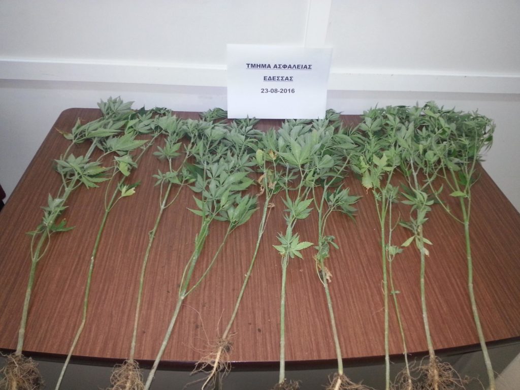 Ειδικότερα, χθες ( 23 -0 8 -2016) το απόγευμα σε αγροτική περιοχή της Πέλλας , εντοπίστηκε από τους αστυνομικούς φυτεία κάνναβης αποτελούμενη από 11 δενδρύλλια, τα οποία όπως προέκυψε από την έρευνα καλλιεργούσε ο 44χρονος και συνελήφθη.