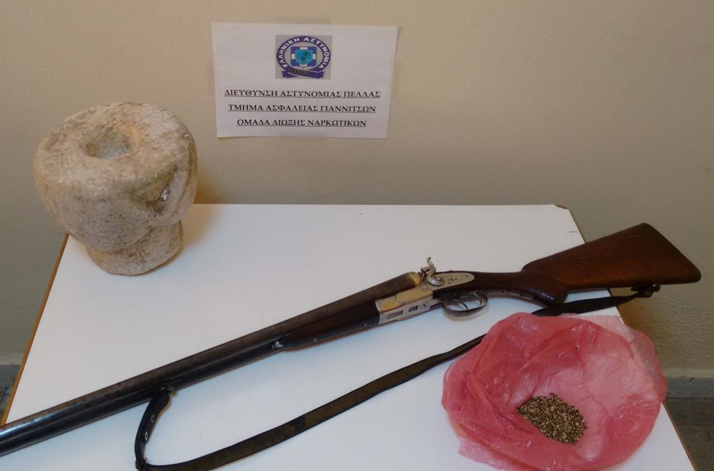 Οι συντονισμένες ενέργειες των αστυνομικών της Ομάδας Δίωξης Ναρκωτικών του Τμήματος Ασφάλειας Γιαννιτσών, είχαν ως αποτέλεσμα τη σύλληψη ενός ατόμου για κατοχή αρχαίου αντικειμένου και φυτών κάνναβης.