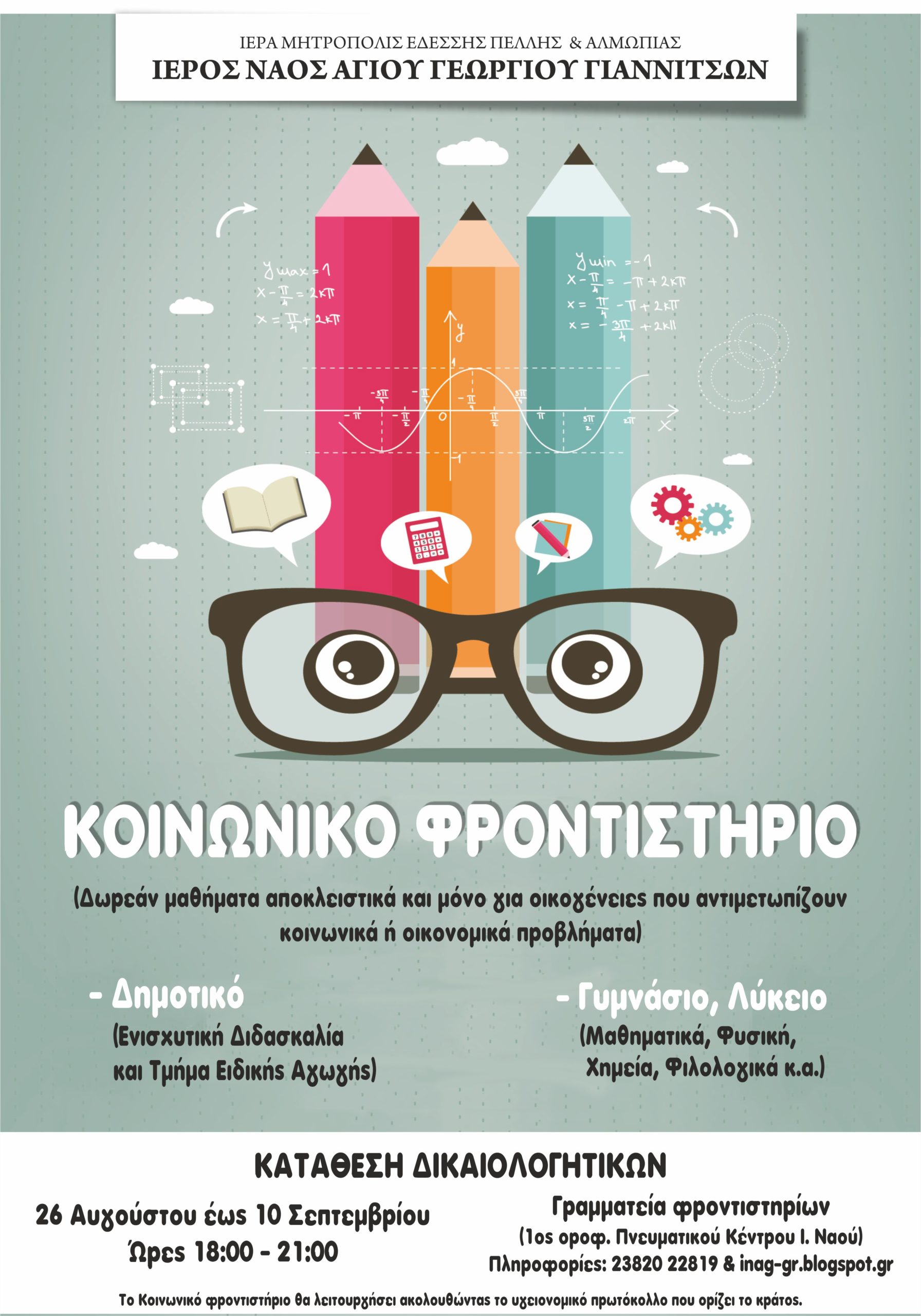Συνεχίζονται οι εγγραφές στα δωρεάν φροντιστηριακά μαθήματα που διοργανώνει η ενορία του Αγίου Γεωργίου Γιαννιτσών, με την αφιλοκερδή προσφορά πολλών καθηγητών και δασκάλων. Τα μαθήματα απευθύνονται σε παιδιά Δημοτικού, Γυμνασίου και Λυκείου και αφορούν αποκλειστικά οικογένειες που αντιμετωπίζουν κοινωνικά ή οικονομικά προβλήματα.