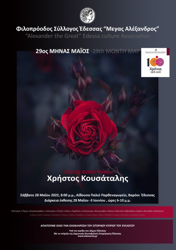 Ο Φιλοπρόοδος Σύλλογος Έδεσσας «Μέγας Αλέξανδρος», θα πραγματοποιήσει τα εγκαίνια της έκθεσης φωτογραφίας του Χρήστου Κουσάταλη,  το Σάββατο 28 Μαΐου 2022 και ώρα 8.00 το απόγευμα, στο Παρθεναγωγείο (Βαρόσι, Έδεσσα).