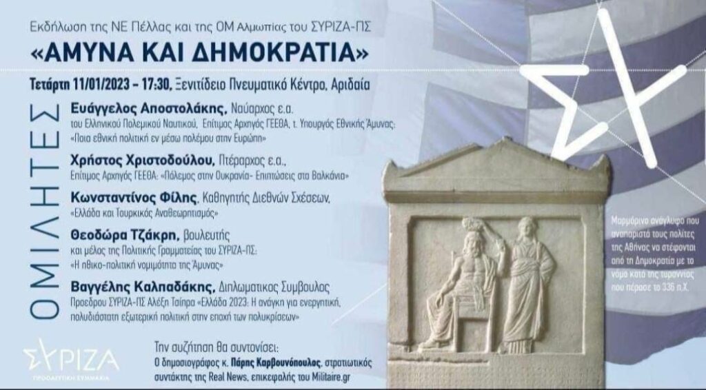 Την ώρα που κάθε εβδομάδα ξεσπά κι ένα σκάνδαλο στους κόλπους της κυβέρνησης, που το θέμα των υποκλοπών δημιουργεί τριγμούς στην δημοκρατία και τα θέματα εξωτερικής πολιτικής της χώρας παραμένουν στην πρώτη γραμμή, η ΝΕ ΠΕΛΛΑΣ και η ΟΜ Αλμωπίας του ΣΥΡΙΖΑ-ΠΣ παρουσιάζουν αξιόλογους ομιλητές σε μια υψηλού κύρους εκδήλωση με θέμα την Άμυνα και την Δημοκρατία στην Ελλάδα.