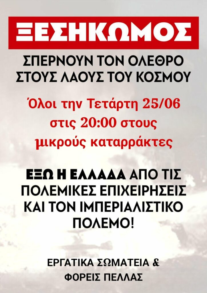 Ο αγώνας πρέπει να δυναμώσει, να αποκτήσει πιο μαζικά και μαχητικά χαρακτηριστικά, να αγκαλιάσει όλους τους φορείς των εργαζομένων, του λαού και της νεολαίας. Καλούμε τους εργαζόμενους στο νομό Πέλλας να οργανώσουν την πάλη τους σε κάθε χώρο δουλειάς και να εκφράσουν την αλληλεγγύη τους στους λαούς της Μ. Ανατολής. Τους συνδικαλιστικούς και άλλους φορείς, τους εργαζόμενους στον ιδιωτικό και δημόσιο τομέα, όλο το λαό να εκφράσουν την αντίθεση τους συμμετέχοντας στις πρωτοβουλίες του σωματείου μας.