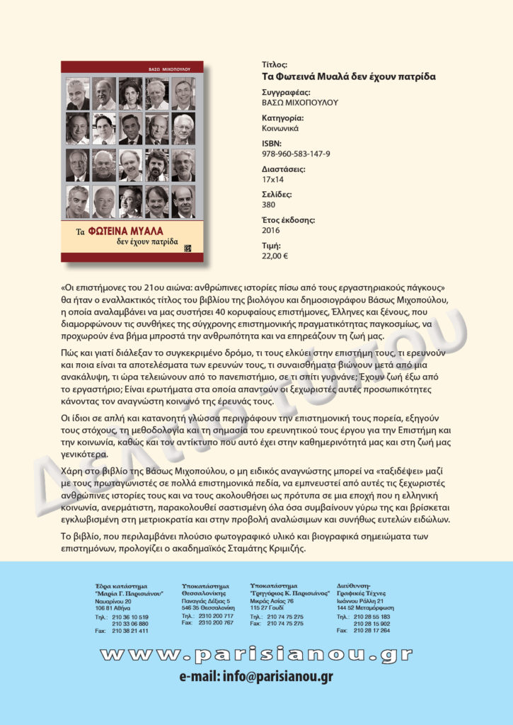 Το βιβλίο «Τα ΦΩΤΕΙΝΑ ΜΥΑΛΑ δεν έχουν πατρίδα», των εκδόσεων Παρισιάνου, που περιλαμβάνει πλούσιο φωτογραφικό υλικό και βιογραφικά σημειώματα των επιστημόνων, προλογίζει ο ακαδημαϊκός Σταμάτης Κριμιζής.