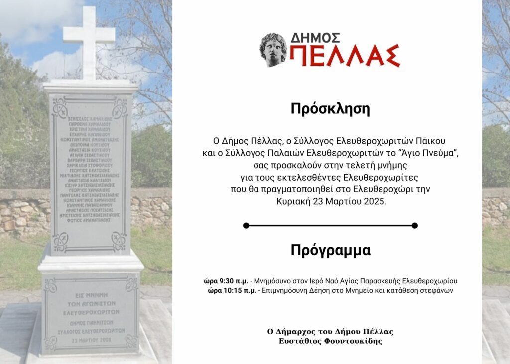 Ο Δήμος Πέλλας, ο Σύλλογος Ελευθεροχωριτών Πάικου και ο Σύλλογος Παλαιών Ελευθεροχωριτών το “Άγιο Πνεύμα”, σας προσκαλούν στην τελετή μνήμης για τους εκτελεσθέντες Ελευθεροχωρίτες που θα πραγματοποιηθεί στο Ελευθεροχώρι την Κυριακή 23 Μαρτίου 2025.