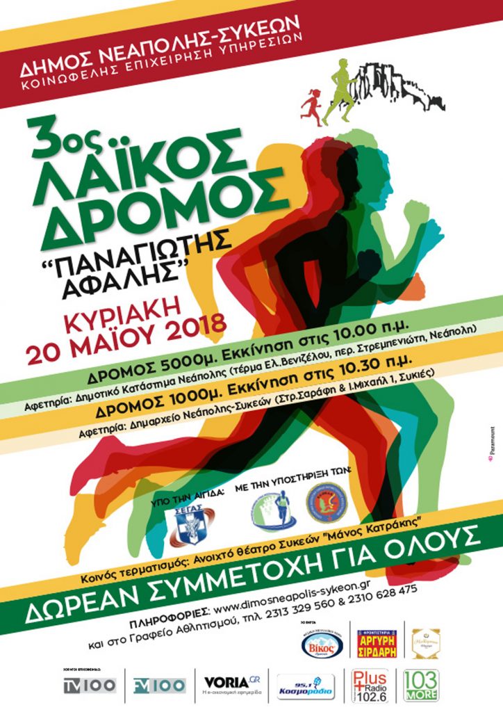 Ο 3ος Λαϊκός Δρόμος «ΠΑΝΑΓΙΩΤΗΣ ΑΦΑΛΗΣ» που θα διεξαχθεί την Κυριακή 20 Μαΐου περιλαμβάνει δυο διαδρομές των 5.000μ. και των 1.000μ. με αφετηρίες τη Νεάπολη και τις Συκιές, και κοινό τερματισμό το Ανοιχτό Δημοτικό Θέατρο «Μάνος Κατράκης» (Συκιές). Διοργανώνεται, δε, σε συνεργασία με την ΕΑΣ ΣΕΓΑΣ και την υποστήριξη των μελών του Συλλόγου Δρομέων Υγείας Θεσσαλονίκης (ΣΔΥΘ) και των τοπικών, αθλητικών και πολιτιστικών συλλόγων.