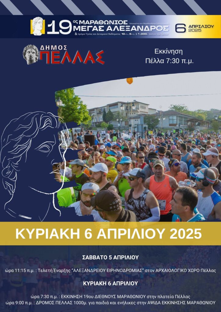 Την Κυριακή 6 Απριλίου, με εκκίνηση από την Πέλλα και με την συμμετοχή δρομέων από όλο τον κόσμο, θα πραγματοποιηθεί ο 19ος Διεθνής Μαραθώνιος Μέγας Αλέξανδρος. Τελεί υπό την αιγίδα της Ελληνικής Εθνικής Επιτροπής για την UNESCO, του Υπουργείου Εσωτερικών (Μακεδονίας – Θράκης), του Υπουργείου Παιδείας, Θρησκευμάτων και Αθλητισμού και της Γενικής Γραμματείας Αθλητισμού, του Υπουργείου Τουρισμού και του Ελληνικού Οργανισμού Τουρισμού, του Υπουργείου Εθνικής Άμυνας και της Ελληνικής Ολυμπιακής Επιτροπής.