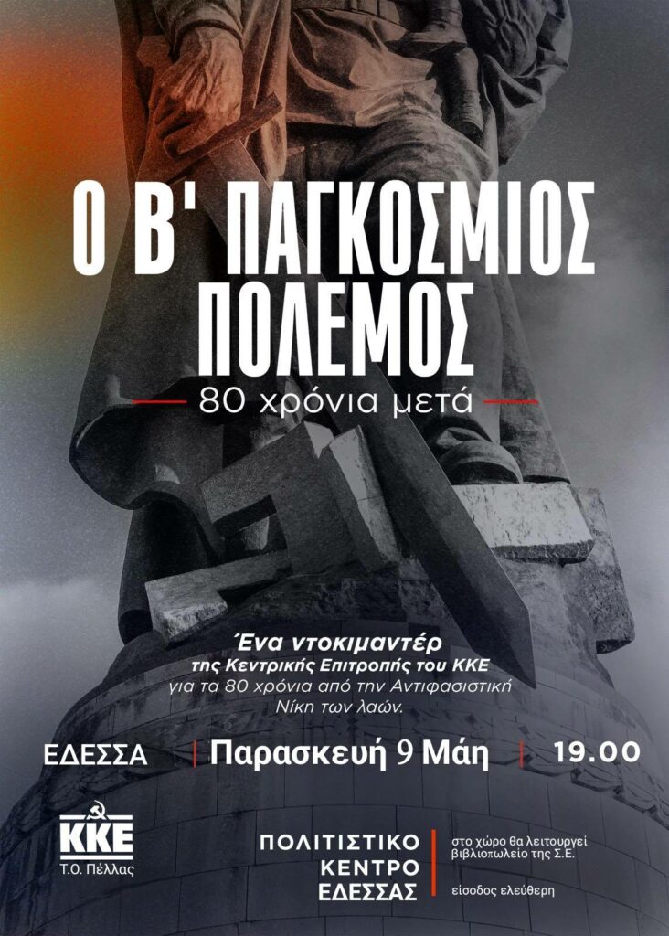 Η Τομεακή Επιτροπή Πέλλας του ΚΚΕ διοργανώνει προβολή ντοκιμαντέρ της Κ.Ε. με τίτλο «Ο Β΄ Παγκόσμιος Πόλεμος, 80 χρόνια μετά» για τα 80 χρόνια από την Αντιφασιστική Νίκη των λαών.