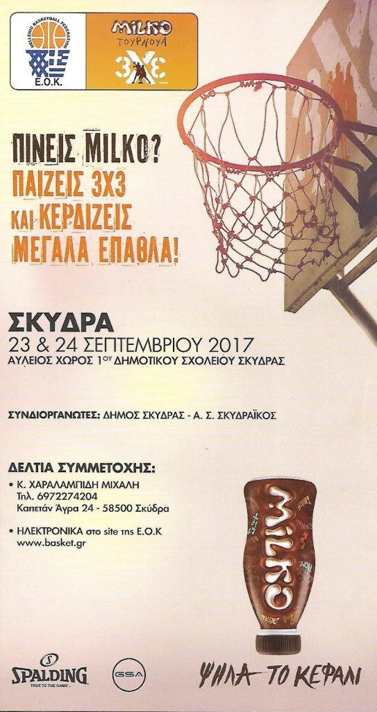 Η Ελληνική Ομοσπονδία Καλαθοσφαίρισης “Ε.Ο.Κ” και το MILKO σε συνεργασία με το δήμο Σκύδρας και τον Α.Σ. ΣΚΥΔΡΑΙΚΟΣ διοργανώνει το ετήσιο αθλητικό MILKO Τουρνουά 3on3 στον αύλειο χώρο του 1ου Δημοτικού Σχολείου Σκύδρας το Σάββατο 23 και την Κυριακή 24 Σεπτεμβρίου.