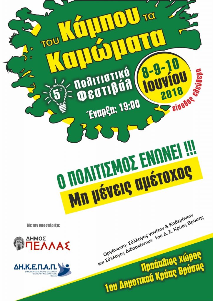 Με κεντρικό σύνθημα «Ο Πολιτισμός Ενώνει! Μη μένεις αμέτοχος!» ο Σύλλογος Γονέων και Κηδεμόνων και ο Σύλλογος Διδασκόντων του 1ου Δημοτικού Σχολείου Κρύας Βρύσης διοργανώνουν για 5η συνεχόμενη χρονιά ένα διαφορετικό πολιτιστικό φεστιβάλ το τριήμερο 8, 9 και 10 Ιουνίου στον προαύλιο χώρο του 1ου Δημοτικού Σχολείου Κρύας Βρύσης (Ελευθερίου Βενιζέλου με Μεταξά γωνία στην Κρύα Βρύση) με τον τίτλο «Του Κάμπου τα Καμώματα».