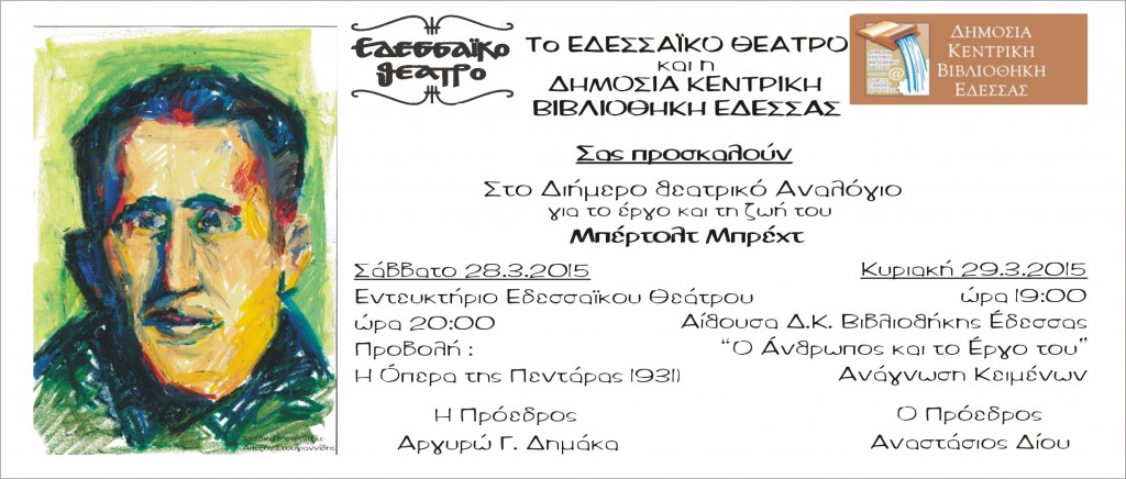 την Κυριακή 29 Μαρτίου 2015 και ώρα 19:00 στην αίθουσα της Δημόσιας Κεντρικής Βιβλιοθήκης Έδεσσας θα γίνει παρουσίαση της ζωής και του έργου του Μπέρτολτ Μπρέχτ και