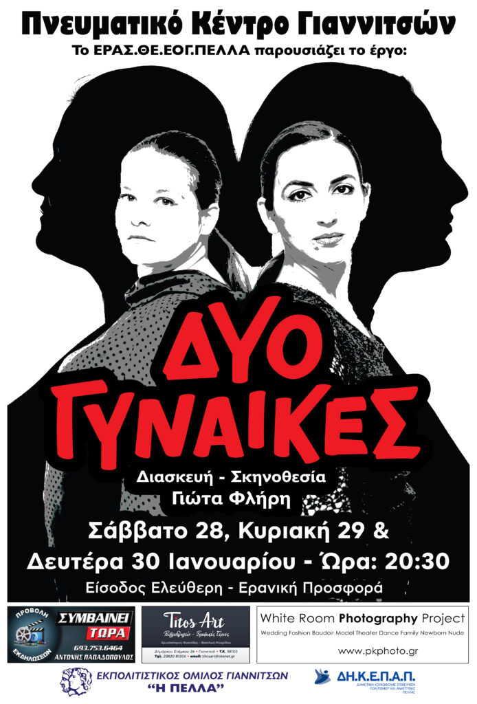 Το ΕΡΑΣ.ΘΕ. Ε.Ο.Γ. “ Η ΠΕΛΛΑ” σε συνδιοργάνωση με την ΔΗΚΕΠΑΠ το Σάββατο 28 την Κυριακή 29 και την Δευτέρα 30 Ιανουαρίου 2023 παρουσιάζει την θεατρική παράσταση «Δύο γυναίκες» σε διασκευή και σκηνοθεσία Γιώτας Φλήρη.