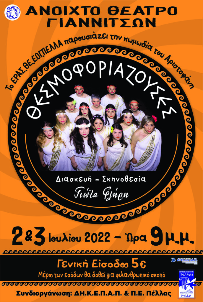 Το ΕΡΑΣ.ΘΕ. Ε.Ο.Γ. “ Η ΠΕΛΛΑ” το Σάββατο 2 και την Κυριακή 3 Ιουλίου 2022 παρουσιάζει την κωμωδία του Αριστοφάνη «Θεσμοφοριάζουσες» σε διασκευή και σκηνοθεσία Γιώτας Φλήρη