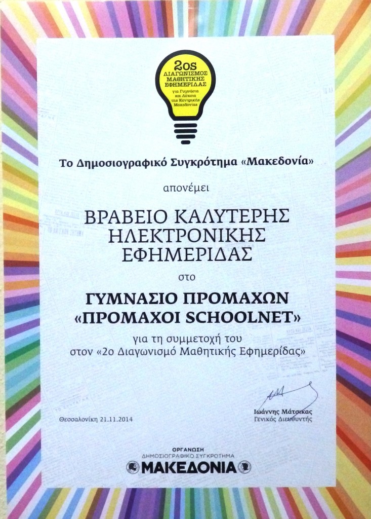 Γίνεται γνωστό ότι το ηλεκτρονικό περιοδικό του Γυμνασίου Προμάχων ΠΡΟΜΑΧΟΙ School Net κέρδισε το βραβείο της καλύτερης σχολικής ηλεκτρονικής εφημερίδας που συνοδεύονταν και από χρηματικό έπαθλο 300 €, στα πλαίσια του 2ου διαγωνισμού μαθητικής εφημερίδας για τα Γυμνάσια και Λύκεια Κεντρικής Μακεδονίας, που διοργάνωσε το δημοσιογραφικό συγκρότημα “ΜΑΚΕΔΟΝΙΑ” της Θεσσαλονίκης σε συνεργασία με την περιφερειακή διεύθυνση εκπαίδευσης Κεντρικής Μακεδονίας.