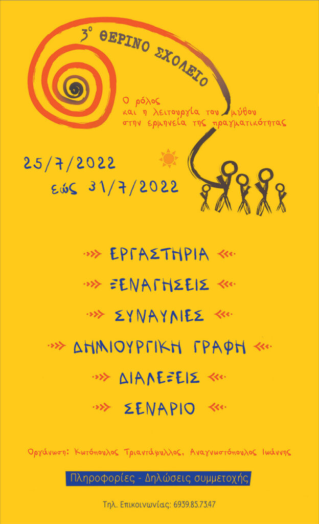 Στην Κλειτορία Καλαβρύτων θα χτυπούν ως μία οι καρδιές του Μύθου και της Πραγματικότητας. Το 3ο Θερινό Σχολείο, που θα διεξαχθεί από τις 25 έως τις 31 Ιουλίου, με την παρουσία 25 φοιτητών από την Ελλάδα και τις Κύπρο, Ιταλία, Βουλγαρία και Βόρεια Μακεδονία και 10 ακαδημαϊκών εκπαιδευτών, αλλά και τη σύμπραξη της Λίνας Νικολακοπούλου και του Κώστα Θωμαΐδη, θα τοποθετήσει ξανά τον Μύθο ως ζωντανό οργανισμό, και όχι μονάχα ως παραβολή, μέσα στα σπλάχνα της πραγματικότητας.