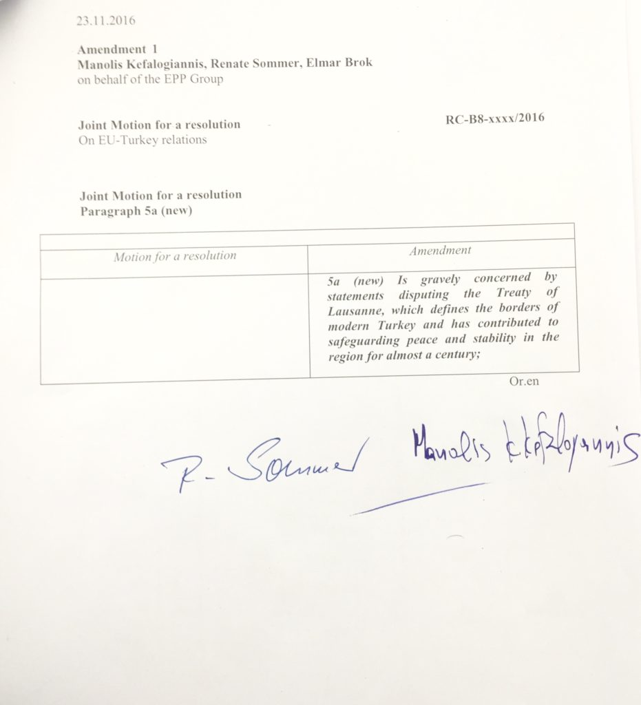 Στην τροπολογία που θα ενσωματωθεί στο Ψήφισμα εκφράζεται η βαθιά ανησυχία του Ευρωπαϊκού Κοινοβουλίου για τις δηλώσεις του Τούρκου προέδρου που αμφισβητούν τη Συνθήκη της Λωζάννης, μία Διεθνής Συνθήκη που συνέβαλλε αποφασιστικά στη διατήρηση της ειρήνης και της σταθερότητας στην περιοχή για περίπου έναν αιώνα