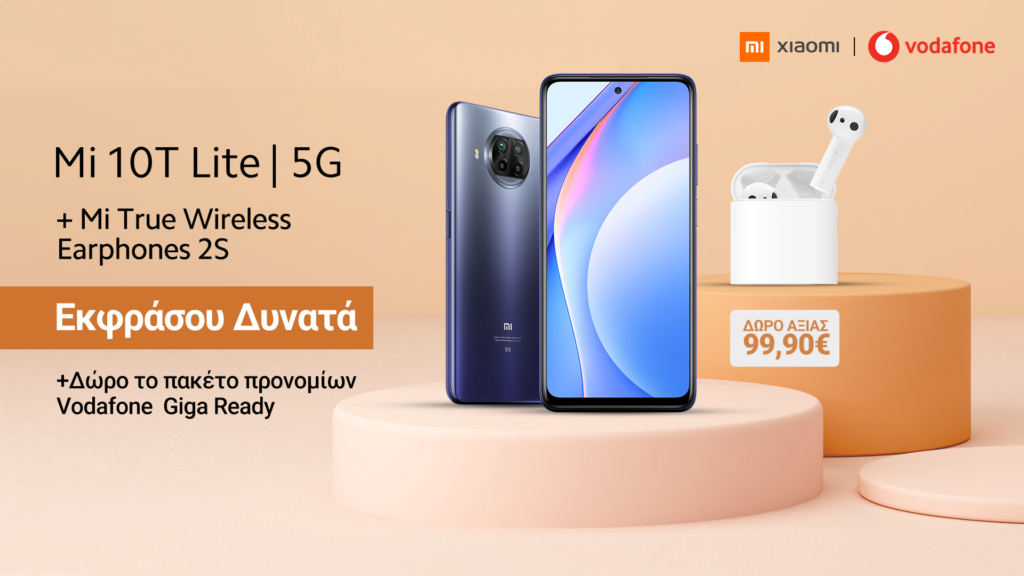 Η Vodafone υποδέχεται το νέο Xiaomi Mi10T Lite δίνοντας τη δυνατότητα σε όλους όσους επιθυμούν να το αποκτήσουν, να επωφεληθούν από ένα μοναδικό Δώρο. Αποκλειστικά για σήμερα από τα καταστήματα Vodafone, αλλά και από το vodafone.gr έως 18 Νοεμβρίου, όσοι αποκτήσουν το νέο Xiaomi Mi10T Lite θα πάρουν δώρο τα MiTrue Wireless Earphones 2S, αξίας 99,90€. Επιπλέον, όλοι οι Vodafone πελάτες θα παίρνουν δώρο και το πακέτο προνομίων Giga Ready με 12GB και -20% στις επισκευές για έναν ολόκληρο χρόνο.