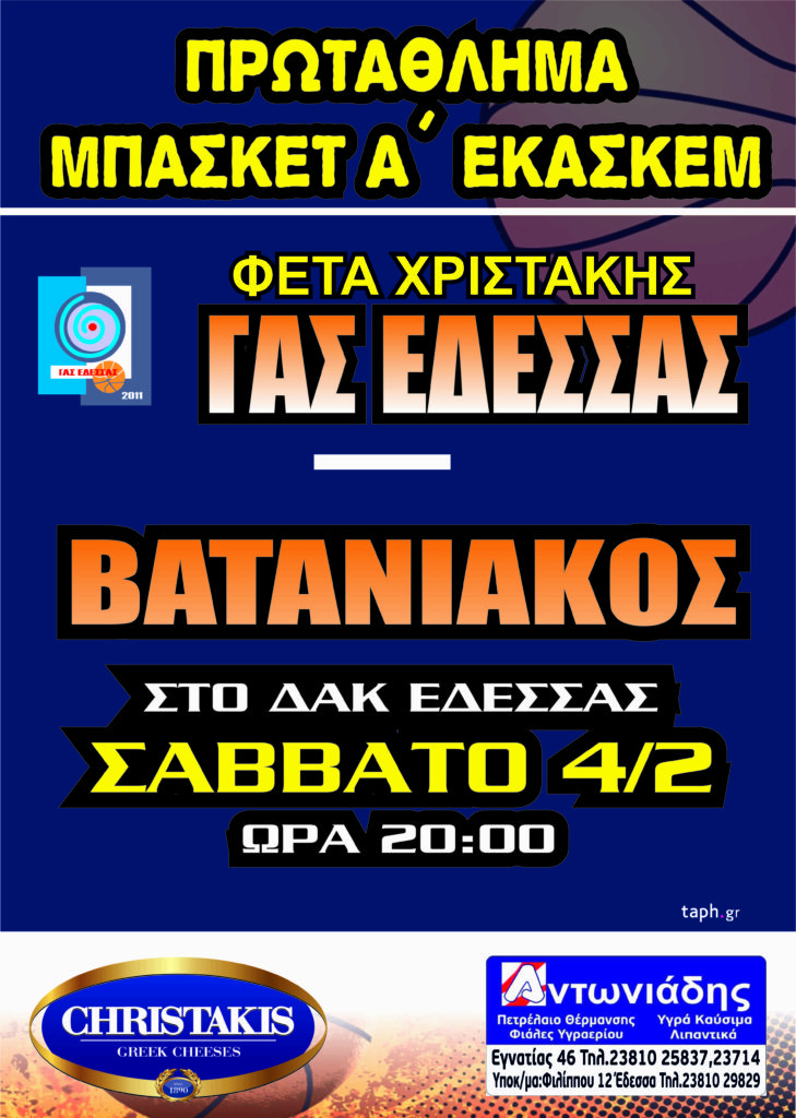 Ο «Φέτα Χριστάκης ΓΑΣ Έδεσσας», στο πλαίσιο της 5ης αγωνιστικής του Β΄ γύρου του πρωταθλήματος της Α΄ ΕΚΑΣΚΕΜ, αντιμετωπίζει τον Βατανιακό και θα προσπαθήσει να επανέλθει στις νίκες, μετά την ήττα από τον ΑΟΚ Βέροιας. Το παιχνίδι θα γίνει το Σάββατο 4/2/2017 στις 20:00, στο ΔΑΚ της πόλης μας.