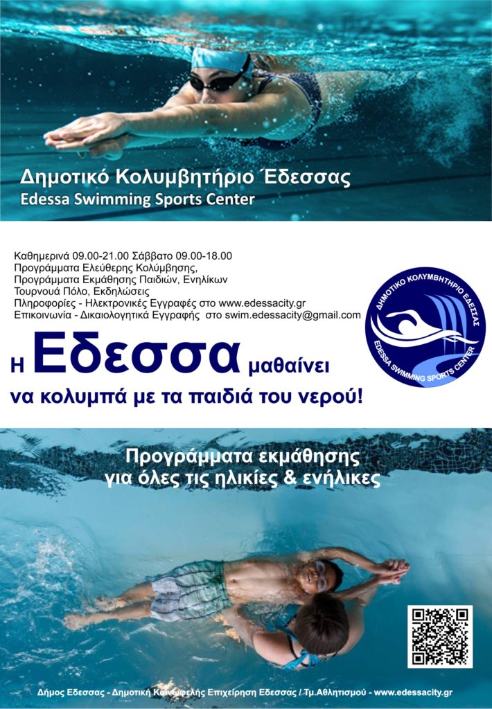 Ο Δήμος Έδεσσας, σε συνεργασία με τη Δημοτική Κοινωφελή Επιχείρηση (ΔΗΚΕΔΕ) και την Πανελλήνια Κολυμβητική Ομοσπονδία, διοργανώνει το 1ο ΦΕΣΤΙΒΑΛ Αθλημάτων Υγρού Στίβου στην Έδεσσα το Σάββατο, 17 Σεπτεμβρίου 2016 στο Κολυμβητήριο της Έδεσσας.