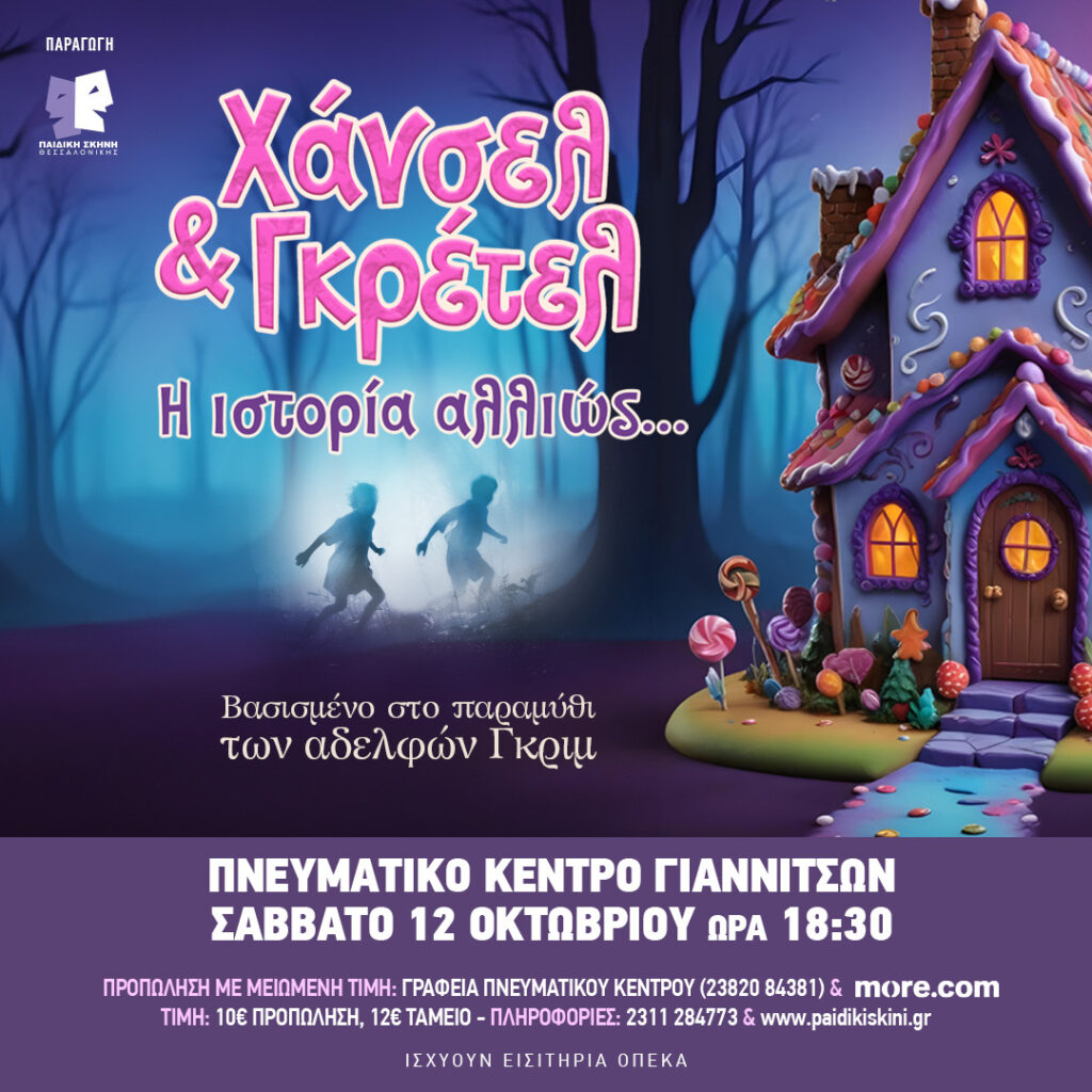 Η Παιδική Σκηνή Θεσσαλονίκης υποδέχεται τη νέα σεζόν με μια αλλιώτικη ιστορία, βασισμένη στο κλασικό παραμύθι των αδελφών Γκριμ, «Χάνσελ και Γκρέτελ». Σε διασκευή και στίχους τραγουδιών Σοφίας Δημοπούλου, σκηνοθεσία Πασχάλη Αραμπατζή και μουσική Αίσωνα, η μουσικοχορευτική παράσταση «Χάνσελ και Γκρέτελ: Η ιστορία αλλιώς» έρχεται στο Πνευματικό Κέντρο Γιαννιτσών, για μια μόνο παράσταση στις 12 Οκτωβρίου στις 18:30.