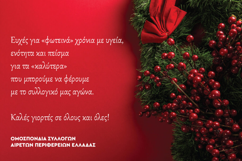 Χριστουγεννιάτικες Ευχές από την ΟΜΟΣΠΟΝΔΙΑ ΣΥΛΛΟΓΩΝ ΥΠΑΛΛΗΛΩΝ ΑΙΡΕΤΩΝ ΠΕΡΙΦΕΡΕΙΩΝ ΕΛΛΑΔΑΣ