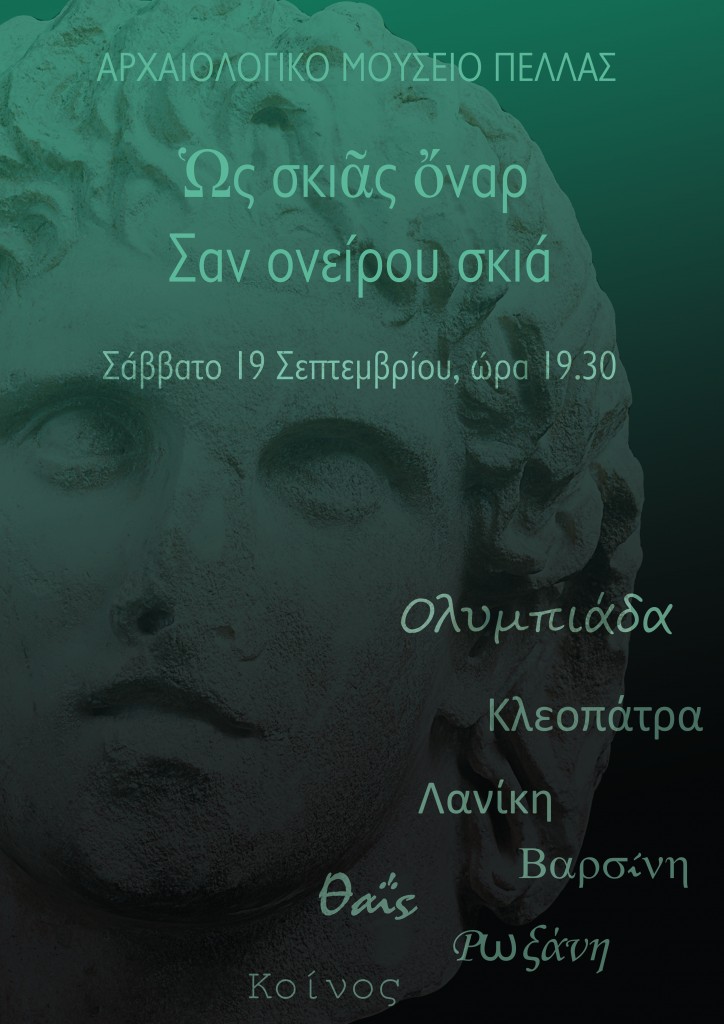 Η Εφορεία Αρχαιοτήτων Πέλλας σας προσκαλεί στο θεατρικό αναλόγιο «Ὡς σκιᾶς ὄναρ – Σαν ονείρου σκιά», που θα παρουσιαστεί το Σάββατο 19 Σεπτεμβρίου 2015, ώρα 19.30, στο αίθριο του Αρχαιολογικού Μουσείου Πέλλας. Την εκδήλωση προλογίζει η Προϊσταμένη της Εφορείας κ. Ελισάβετ Τσιγαρίδα.