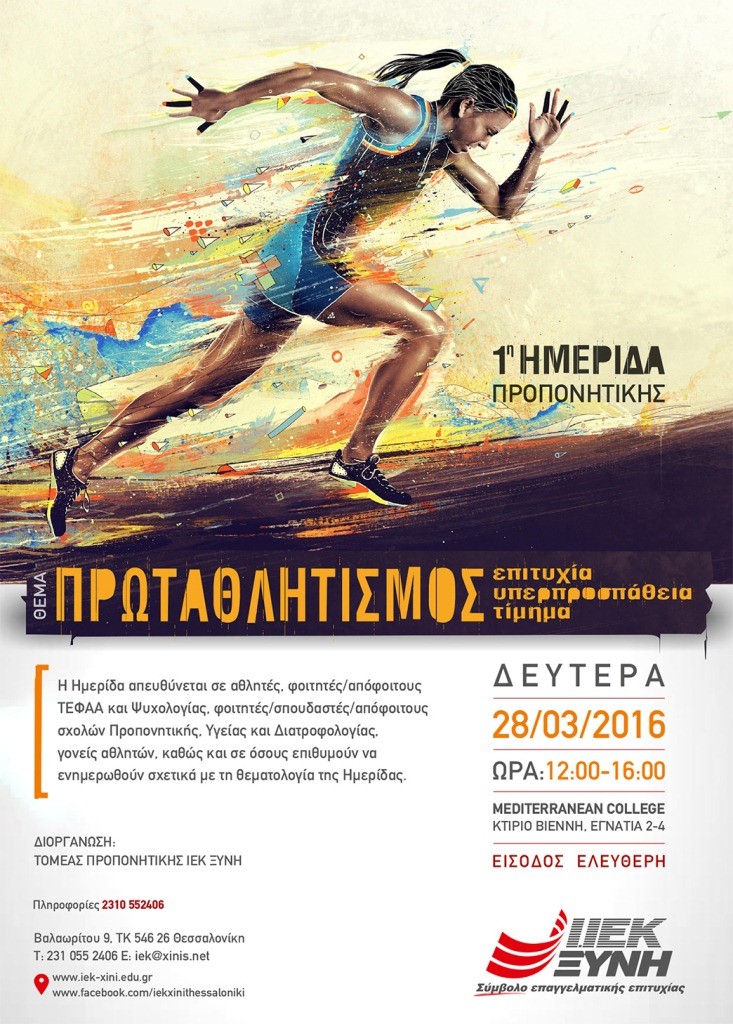Σε όλα αυτά τα ερωτήματα και σε ακόμα περισσότερα, θα δώσει απαντήσεις η 1η Ημερίδα Προπονητικής του Ι.ΙΕΚ ΞΥΝΗ Μακεδονίας, με θέμα: «Πρωταθλητισμός: Επιτυχία – Υπερπροσπάθεια – Τίμημα». Η Ημερίδα θα πραγματοποιηθεί τη Δευτέρα 28 Μαρτίου 2016 στις 12.00, στην αίθουσα διαλέξεων του Mediterranean College Θεσσαλονίκης, Εγνατία 2-4, κτίριο ΒΙΕΝΝΗ.