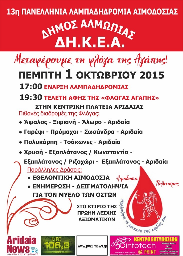 13η Λαμπαδηδρομία Αιμοδοσίας στον Δήμο Αλμωπίας την Πέμπτη 1 Οκτωβρίου