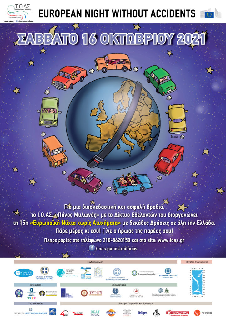 Σε μια περίοδο που, με μεγάλη ανησυχία, παρακολουθούμε τους δείκτες τροχαίων δυστυχημάτων να αυξάνονται, το Ινστιτούτο Οδικής Ασφάλειας (Ι.Ο.ΑΣ.) «Πάνος Μυλωνάς» συνεχίζει δυναμικά τις δράσεις ενεργοποίησης και ευαισθητοποίησης των πολιτών για «έναν κόσμο χωρίς τροχαία δυστυχήματα». Έτσι,  το Σάββατο 16 Οκτωβρίου 2021, διοργανώνει, όπως κάθε χρόνο, την 15η «Ευρωπαϊκή Νύχτα χωρίς Ατυχήματα» σε μεγάλες πόλεις στην Ελλάδα.