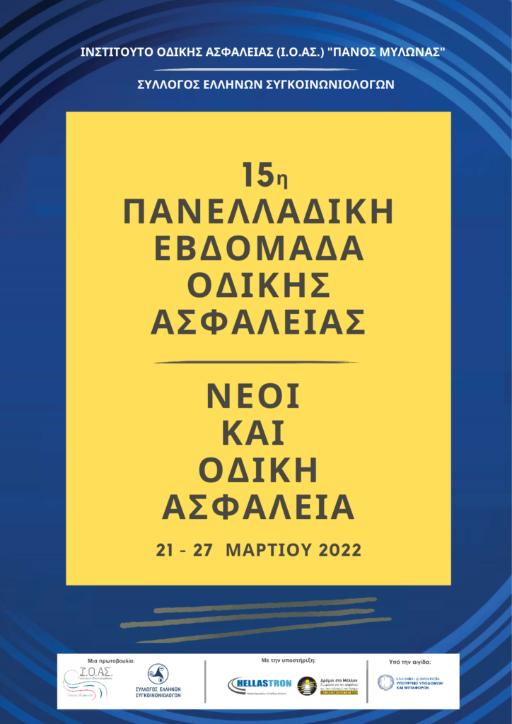 Για 15η συνεχή χρονιά πραγματοποιείται η Πανελλαδική Εβδομάδα Οδικής Ασφάλειας, που διοργανώνεται από το Ινστιτούτο Οδικής Ασφάλειας (Ι.Ο.ΑΣ.) «Πάνος Μυλωνάς», σε συνεργασία με το Σύλλογο Ελλήνων Συγκοινωνιολόγων (Σ.Ε.Σ), με την υποστήριξη του φορέα «ΕΛΛΗΝΙΚΕΣ ΥΠΟΔΟΜΕΣ και ΟΔΟΙ ΜΕ ΔΙΟΔΙΑ» με διακριτικό τίτλο «HELLASTRON», της Συμμαχίας για την Ασφάλεια και τον Πολιτισμό στο Δρόμο «Δρόμοι στο Μέλλον» και τη στήριξη πλήθους άλλων φορέων και οργανώσεων. Η Πανελλαδική Εβδομάδα Οδικής Ασφάλειας τελεί υπό την Αιγίδα του Υπουργείου Υποδομών και Μεταφορών. Την εβδομάδα αυτή συσπειρώνονται φορείς και δυνάμεις της χώρας μας για την προώθηση κρίσιμων ζητημάτων κυκλοφοριακής αγωγής και οδικής ασφάλειας ενώ, παράλληλα, πραγματοποιούνται δράσεις ενημερωτικού, εκπαιδευτικού και θεσμικού χαρακτήρα.