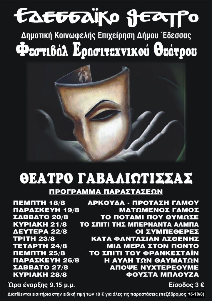 Μια θεατρική διαδρομή, ένα γοητευτικό θεατρικό ταξίδι μας κλείνει ραντεβού από τις 18 έως τις 28 Αυγούστου. Η σκηνή του ανοιχτού θεάτρου Γαβαλιώτισσας, εκεί που ο Λόρκα θα συναντήσει τον Τσέχωφ και τον Μολιέρο αλλά και ο Καμπανέλλης τους Ρέππα-Παπαθανασίου, θα αποτελέσει βήμα έκφρασης και καλλιτεχνικής δημιουργίας για τα σχήματα που θα φιλοξενήσουμε, αφού θα παρουσιάσουν έργα του σύγχρονου και κλασικού ρεπερτορίου που με ολοφάνερη την αγάπη τους για το θέατρο, υπόσχονται να δώσουν τον καλύτερο εαυτό τους.