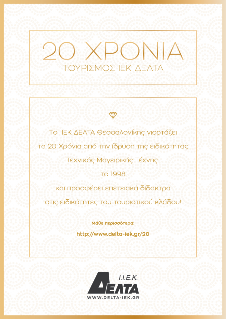Γιορτάζοντας τα 20 Χρόνια στην κατάρτιση Τουριστικών Επαγγελματιών, το ΙΕΚ ΔΕΛΤΑ Θεσσαλονίκης, προσφέρει σε όλους τους σπουδαστές που θα επιλέξουν να σπουδάσουν ένα από τα επαγγέλματα του τουριστικού κλάδου τη δυνατότητα να κατοχυρώσουν τη θέση τους για τα τμήματα Οκτωβρίου με επετειακά δίδακτρα!