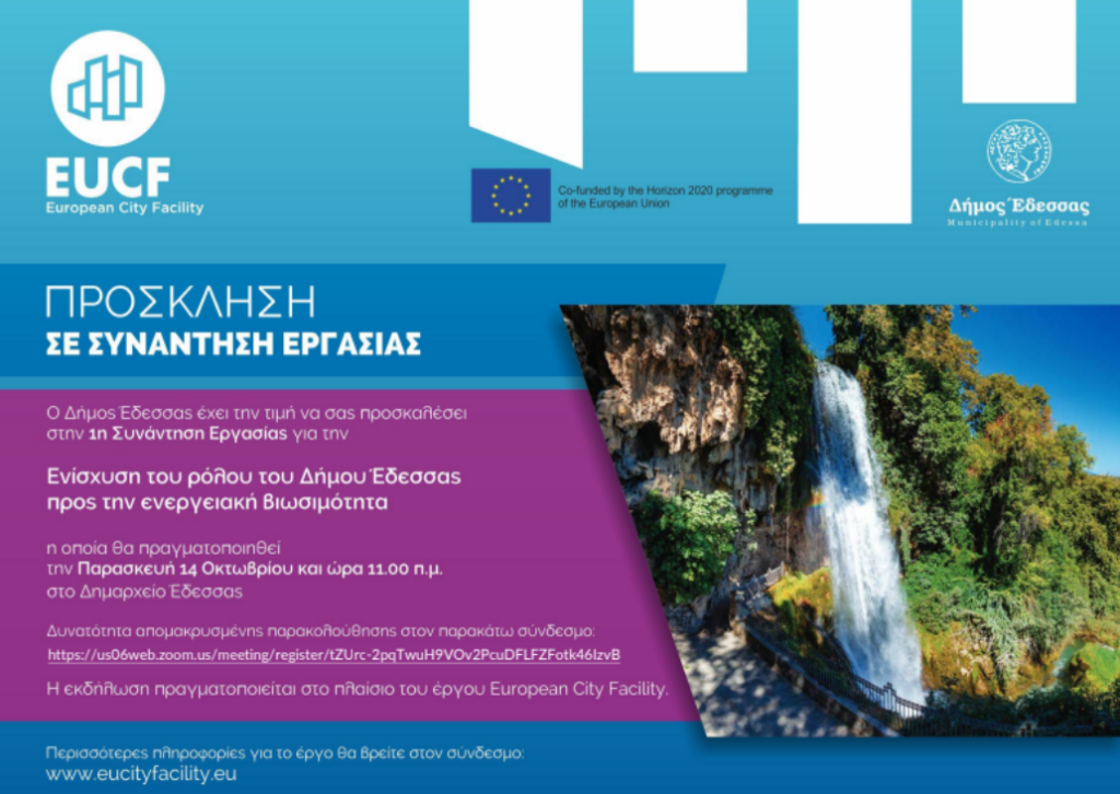Ο Δήμος Έδεσσας αποτελεί τον δεύτερο δήμο της Ελλάδας που κατάφερε να εξασφαλίσει χρηματοδότηση από την ευρωπαϊκή πρωτοβουλία European City Facility (EUCF) του προγράμματος Horizon 2020. Στο πλαίσιο της 3ης Πρόσκλησης του European City Facility ο Δήμος Έδεσσας ήταν ένας από τους 166 δήμους που κατέθεσαν προτάσεις για την επιχορήγησή τους. Η Επιτροπή Αξιολόγησης της Πρωτοβουλίας ενέκρινε 69 από αυτές, ανάμεσά τους και της Διεύθυνσης Προγραμματισμού, Ανάπτυξης και Πληροφορικής του Δήμου Έδεσσας για την κατάρτιση ενός Επενδυτικού Σχεδίου για την ενίσχυση της πορείας του προς την ενεργειακή βιωσιμότητα.