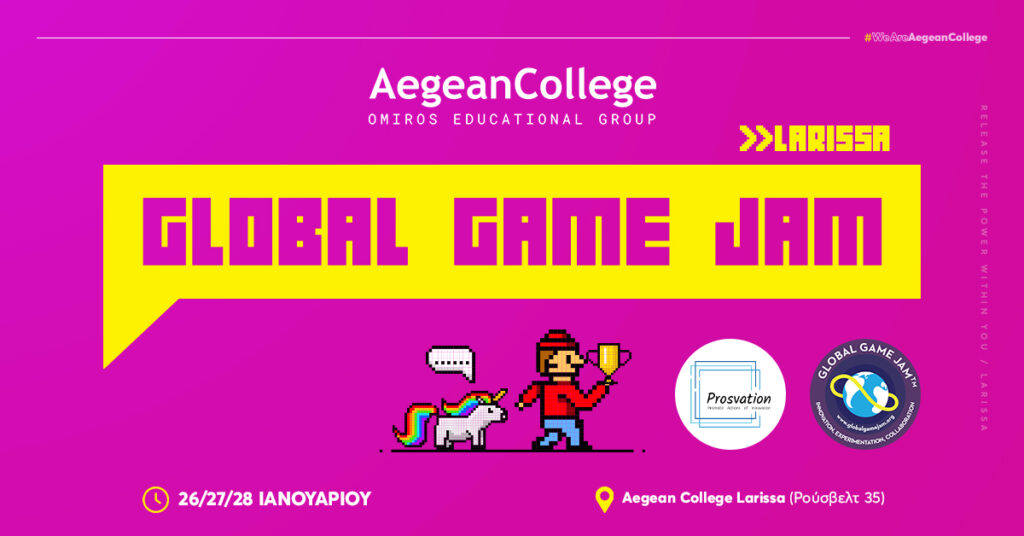 Η Σχολή Πληροφορικής & Νέων Τεχνολογιών του Aegean College Λάρισας, σε συνεργασία με την Prosvation και την IndiePump, διοργανώνουν το 2ο Larissa Global Game Jam, την Παρασκευή, 26, το Σάββατο, 27 και την Κυριακή, 28 Ιανουαρίου 2024 με ελεύθερη είσοδο, στις εγκαταστάσεις του Κολλεγίου, Ρούσβελτ 35.