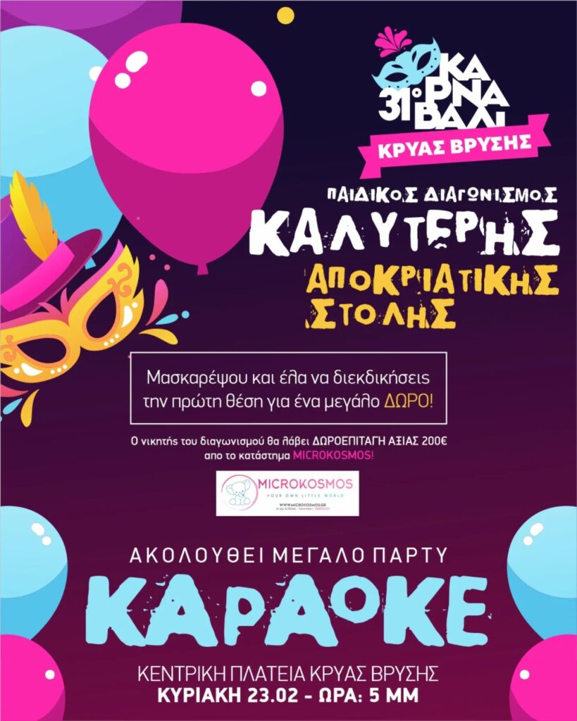 Αύριο Κυριακή 23 Φεβρουαρίου 2025 ανοίγει η αυλαία των εκδηλώσεων στο κεντρικό πάρκο της Κρύας Βρύσης στις 5:00μ.μ με τον 1ο Παιδικό διαγωνισμό καλύτερης αποκριάτικης στολής. Γίνε Καρναβάλι και διεκδίκησε την πρώτη θέση και το μεγάλο έπαθλο του διαγωνισμού, μια δωροεπιταγή αξίας 200,00€ Αμέσως μετά στις 6:30 μ.μ. ακολουθεί το μεγάλο Πάρτυ Καραόκε!