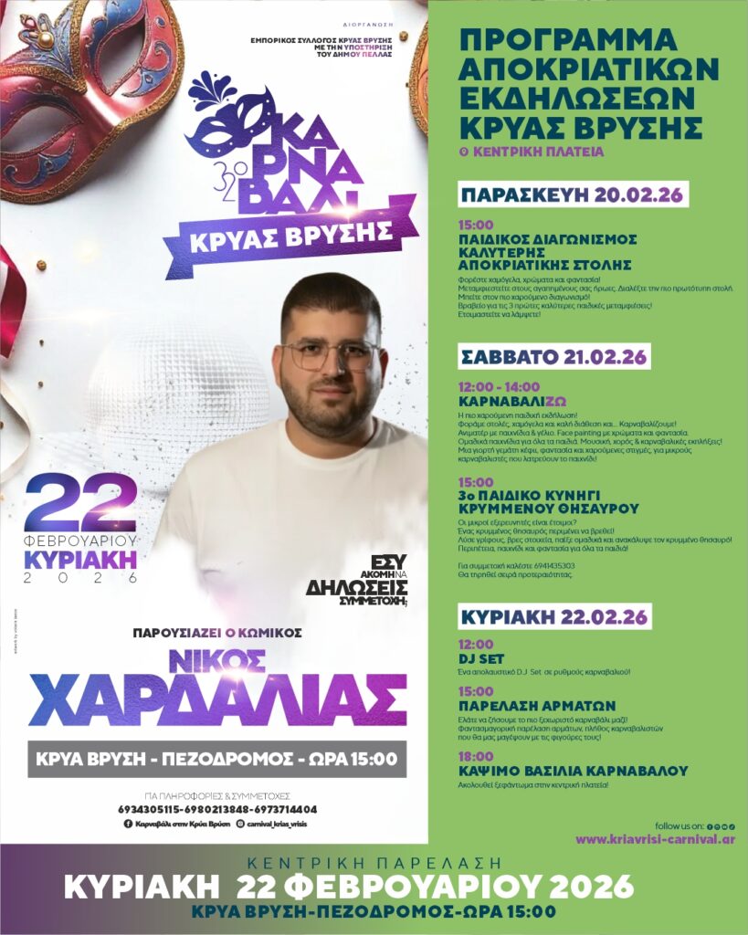 Για πληροφορίες και δηλώσεις συμμετοχών ανατρέξτε στην επίσημη σελίδα στο Instagram carnival_krias_vrisis και στο facebook Καρναβάλι στην Κρύα Βρύση.