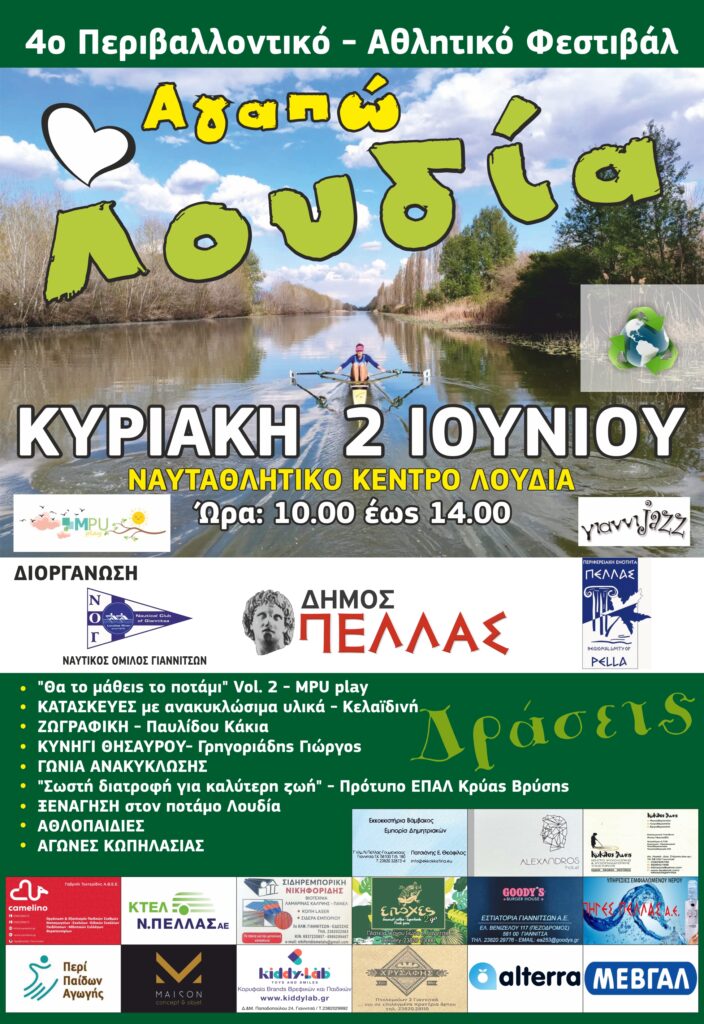 Ο Ναυτικός Όμιλος Γιαννιτσών (Ν.Ο.Γ.) και ο Δήμος Πέλλας, με την αρωγή της Περιφερειακής Ενότητας Πέλλας και με οδηγό την αγάπη για τον αθλητισμό & το περιβάλλον, διοργανώνουν μία ημέρα γεμάτη δραστηριότητες ΣΤΟ ΠΟΤΑΜΙ ΜΑΣ, τον Λουδία, με κύριο στόχο την διασκέδαση μικρών και μεγάλων.